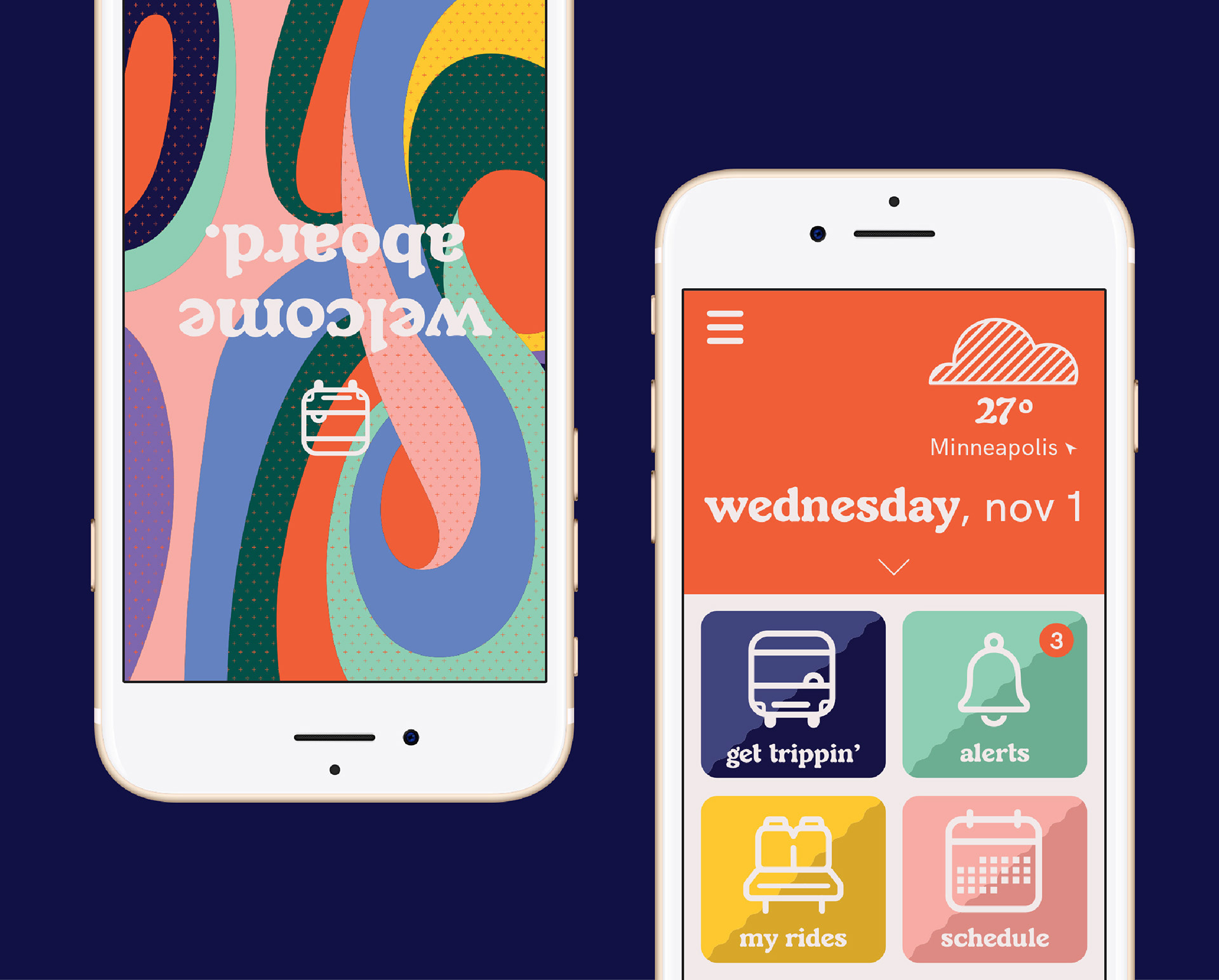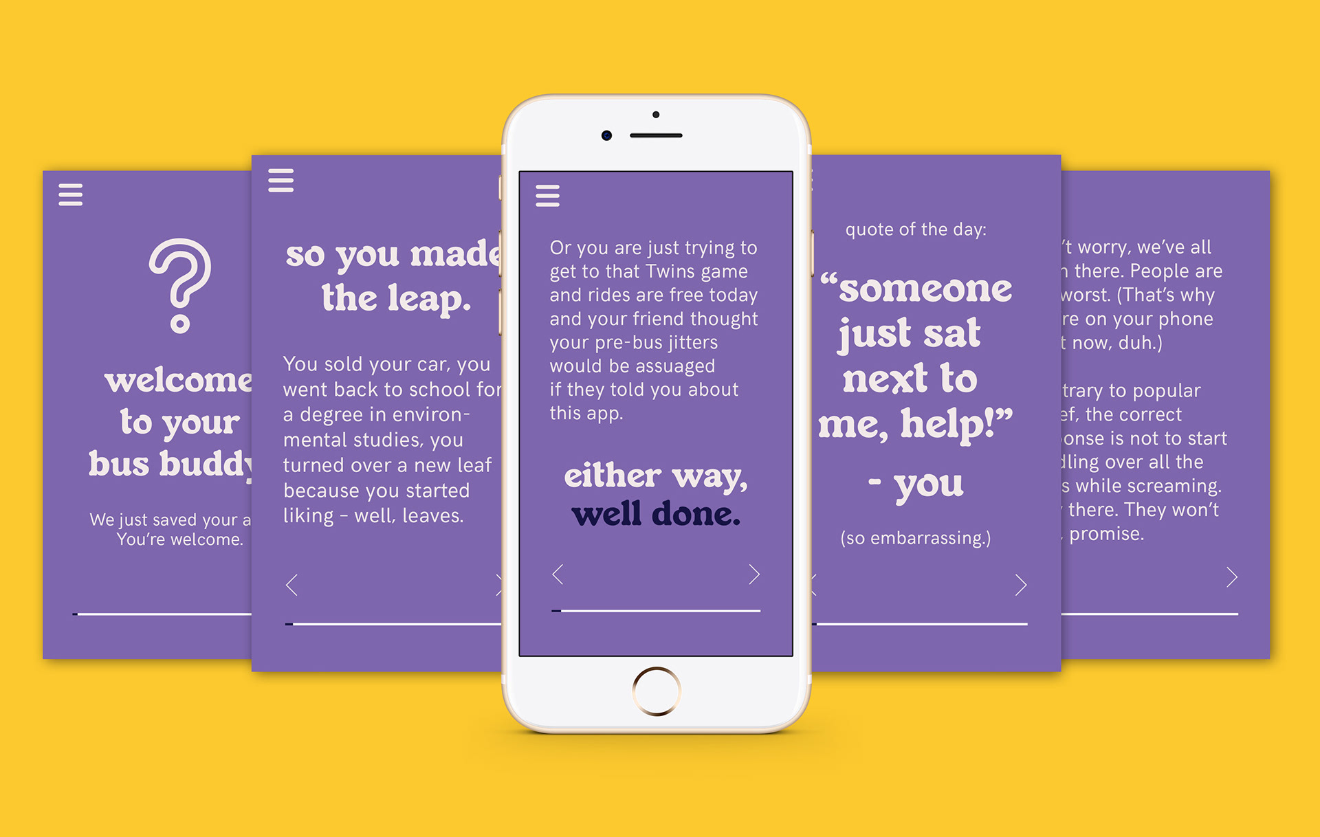 Public transportation is not the cultural norm in Minneapolis. The surplus of private cars are rapidly becoming an urgent problem for both the environment as well as the city infrastructure. After countless conversations and hours of commuting on the bus myself, I realized that it is the unfamiliarity with the system that hinders many people from getting out of their cars and into buses and light rails. To make that transition as seamless as possible, I imagined Straight Trippin' as a friendly, sassy app to accompany first time commuters, in addition to designing a promotional campaign around it.